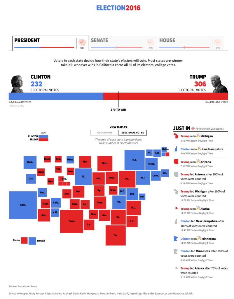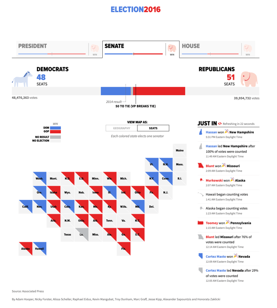 For the 2016 election, I designed HuffPost’s live-updating results site, which showed results on election night for presidential, House and Senate races.