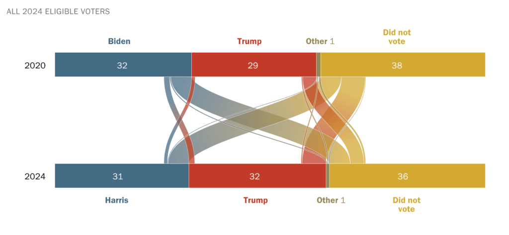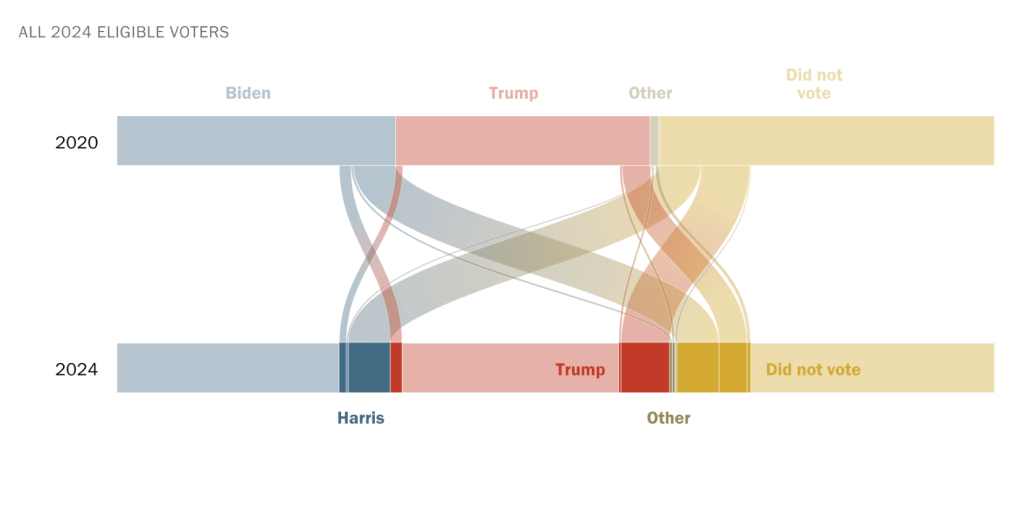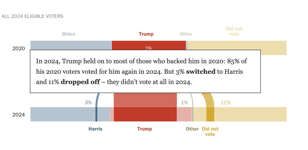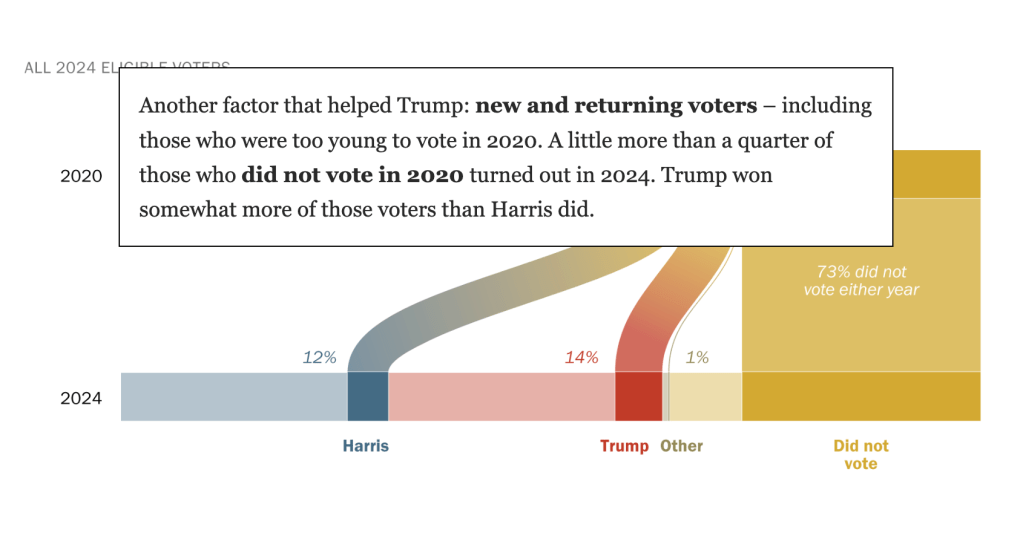 To accompany a report on 2024 validated voters, I worked closely with researchers and developers to create visuals for this explainer on Americans who changed how or if they voted between 2020 and 2024. Scroll through the graphics for annotations on each.